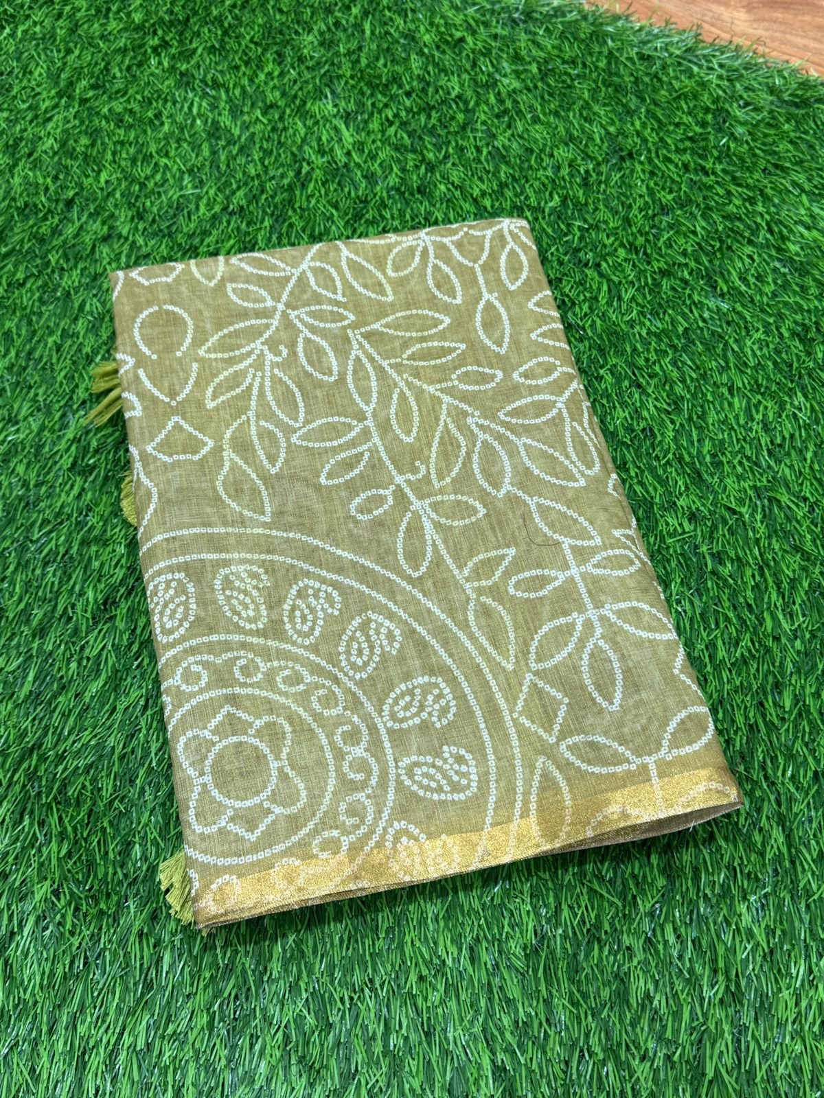 Bandhani Linen Cotton Saree – Olive Green