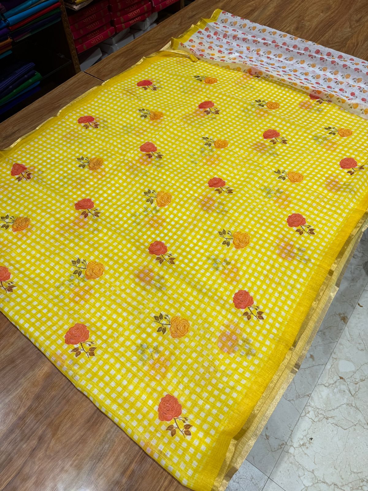 Be the first to review “Linen Cotton Saree – Rose Design – Bright Yellow”