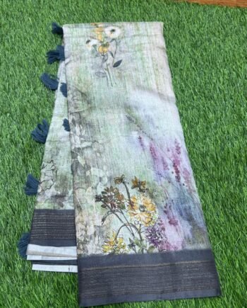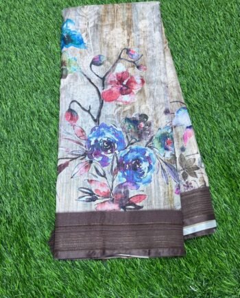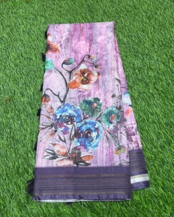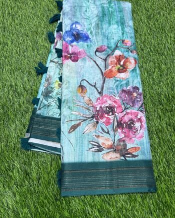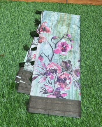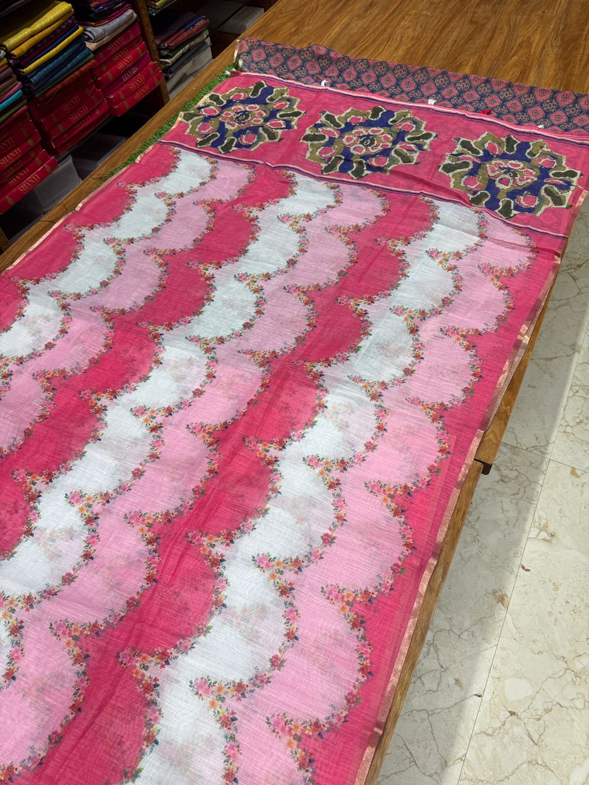 Premium Linen Cotton Saree – Floral Wave with Ajrakh Blouse – Bright Pink
