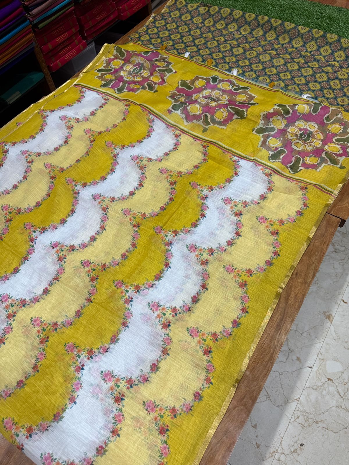 Premium Linen Cotton Saree – Floral Wave with Ajrakh Blouse – Bright Yellow