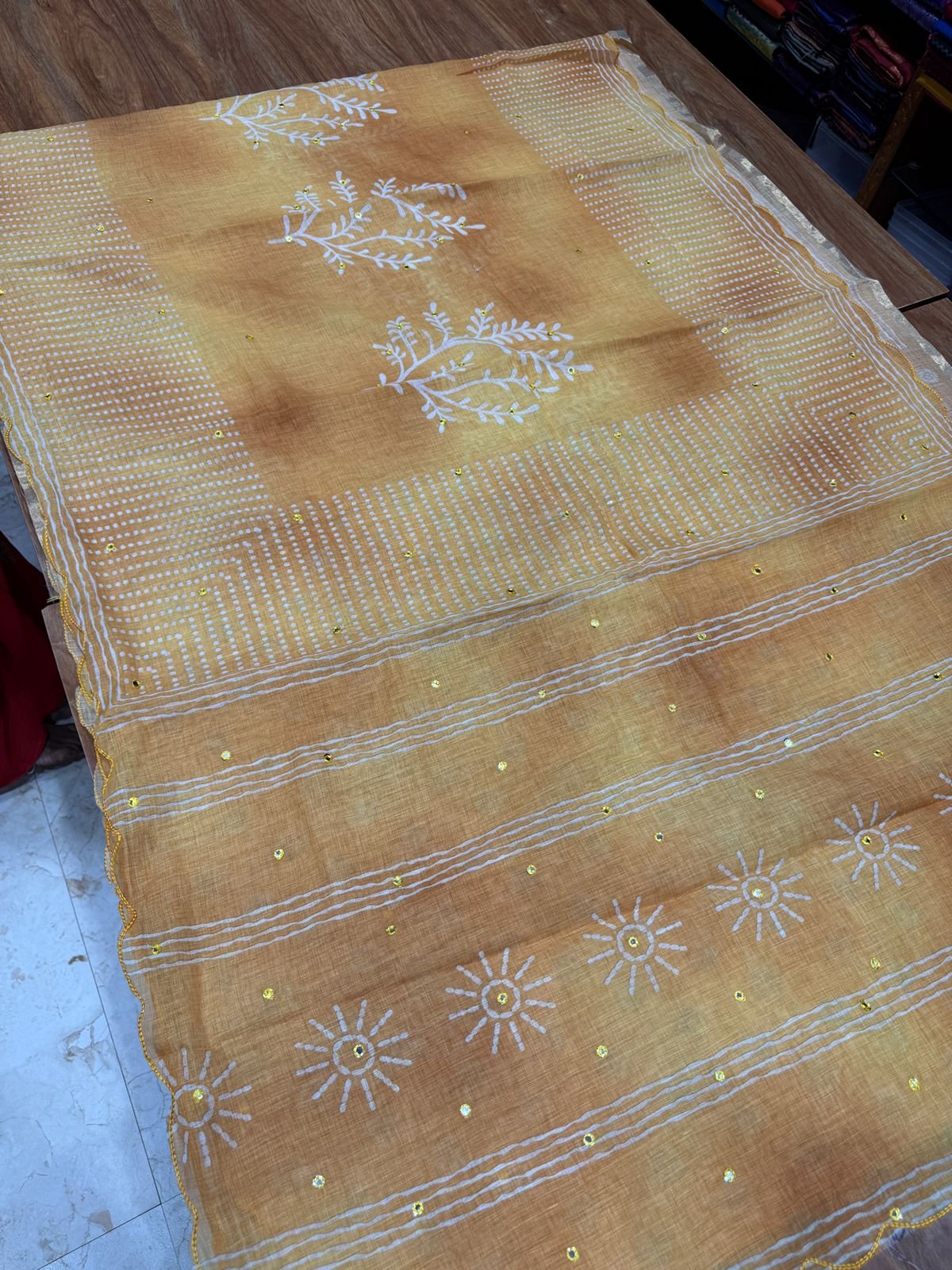 Premium Linen Cotton Saree – Mirror work and scalp border – Yellow Tye and Dye