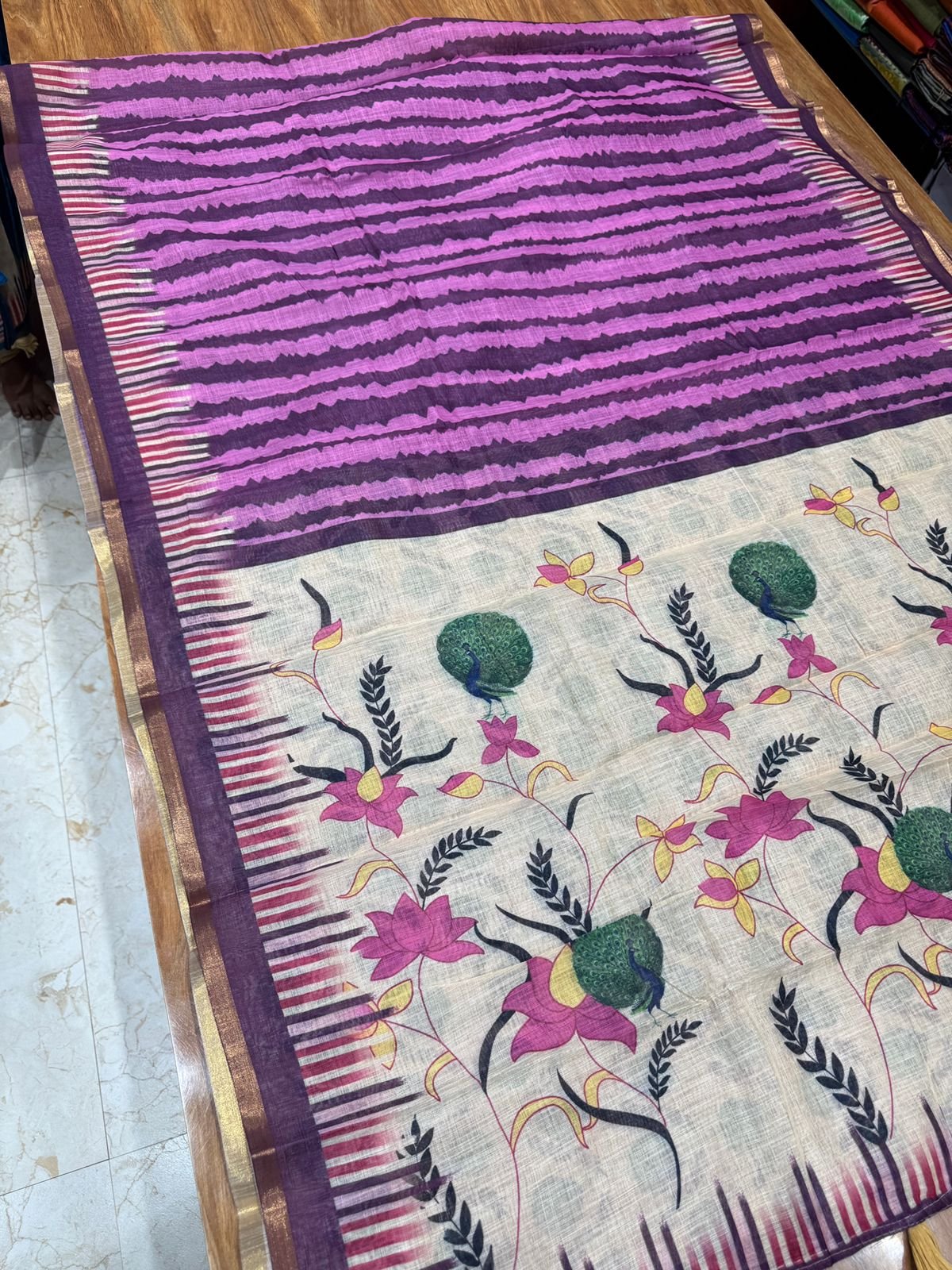 Premium Linen Cotton Saree – Shibori with Floral Pallu and Kalamkari Blouse – 2